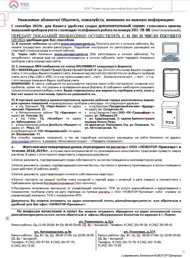 Помимо этого получить необходимую информацию потребители смогут, зарегистрировавшись в личном кабинете на сайте компании novogor.perm.ru. С помощью личного кабинета можно: