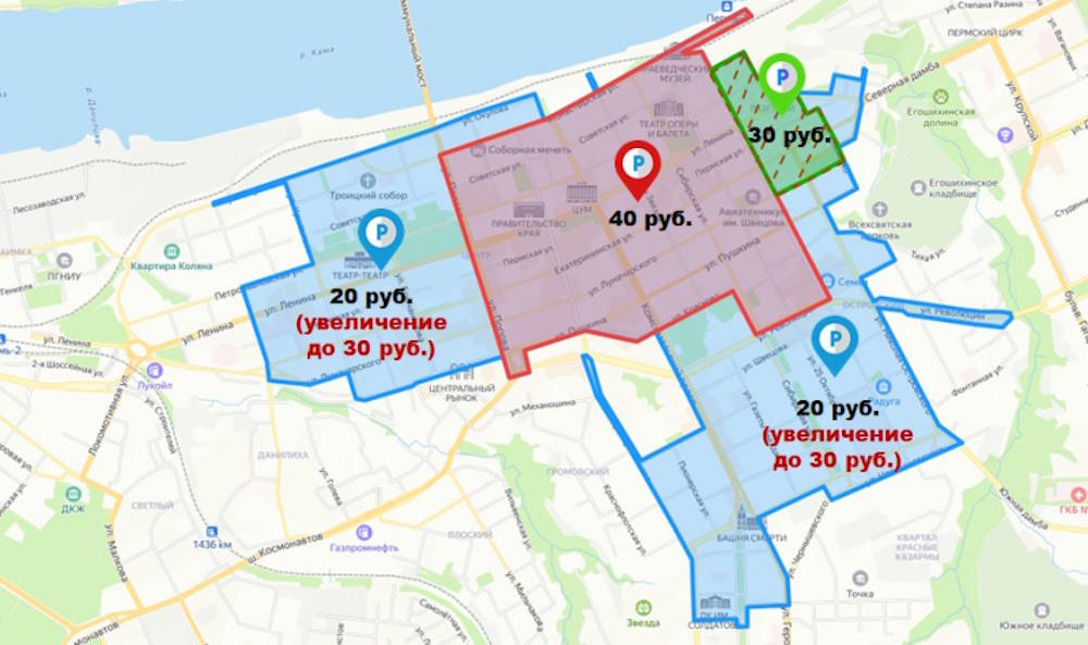 В самом центре города - в зоне 102 - стоимость останется на уровне 40 рублей в час.
