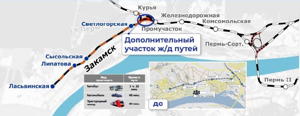 В Перми продолжается работа над проектом по организации маршрута для скоростных поездов «Ласточка» до Закамска. Для этого потребовалось принять участок путей из собственности одного из предприятий города в ведение РЖД. Для этого было заключено 4-х стороннее соглашение о сотрудничестве между Правительством Пермского края, заводом, Администрацией Перми и ОАО «РЖД». «После передачи участка потребуется модернизация путей. Запуск пассажирских перевозок будет возможен только после этих мероприятий, он планируется в 2030 году», - сообщил минтранс.