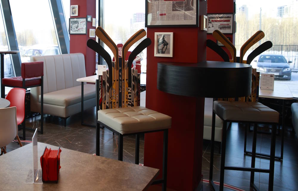 Например, спинки некоторых стульев выполнены в виде хоккейных клюшек. На стенах – фотографии хоккеистов. В кафе панорамные окна и более 20 посадочных мест. В меню – салаты, суп, горячие блюда, блины.