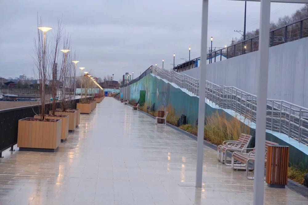 На новом участке построили прогулочную зону, велосипедную дорожку, детскую площадку, высадили деревья и разбили клумбы. Одно из двух новых зданий отдано под пункт проката роликовых и ледовых коньков с парковкой для велосипедов на крыше, во втором разместилась комната матери и ребенка, туалет и помещение под кафе. На крыше второго павильона оборудована тихая зона с лавочками.