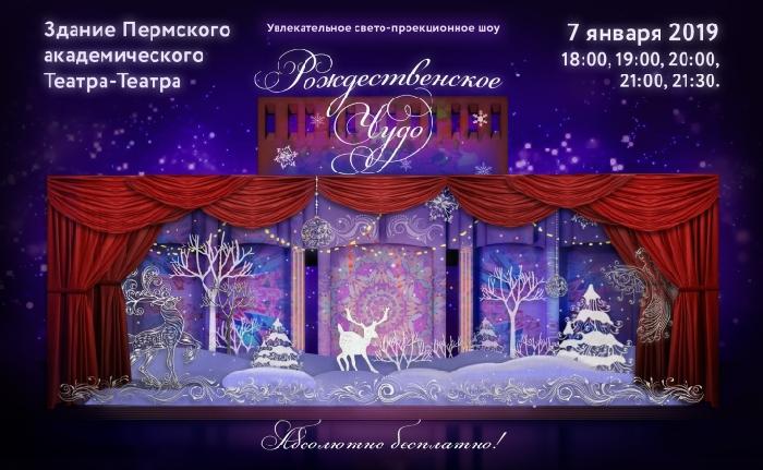 Вечером 7 января в Перми на здании Театра-Театра покажут проекционное шоу «Рождественское чудо». При помощи современного оборудования здание театра превратится в «магазин игрушек». Перед зрителями развернётся история, показывающая, что внутри каждого взрослого есть ребенок, который может верить в чудеса.