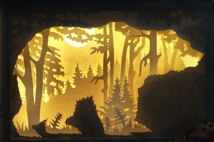Необычные картины выполнены из бумаги, которая собрана специальным образом в несколько слоев, и подсвечены лампочками в коробке. Лампочки - электрические, для их работы к коробочкам подключается провод.