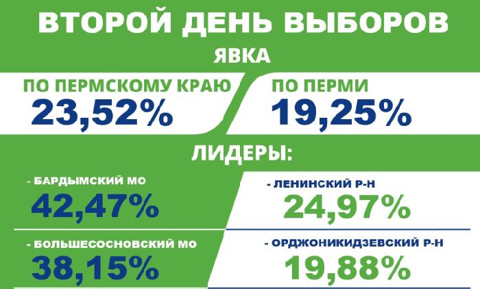 По данным крайизбиркома, лидером по явке в регионе является Бардымский муниципальный округ - 42,47%. В Перми лучшим районом по явке стал Ленинский - 24,97%.