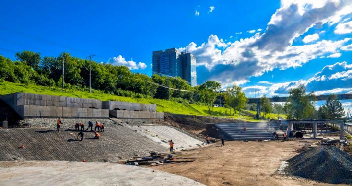 На набережной на участке от моста до порта завершается строительство спортивной зоны - ее откроют в конце этого года, в следующем пройдут завершающие работы по озеленению.