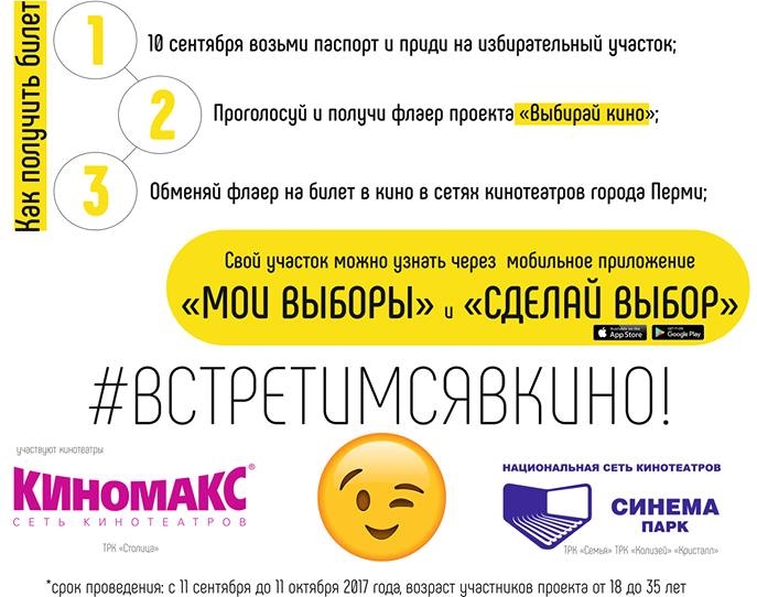 Молодые пермяки, которые придут на избирательные участки 10 сентября, получат бесплатные билеты в кино. Как сообщает НКО «Студенческие отряды», в акции могут принять участие все избиратели в возрасте от 18 до 35 лет. На избирательных участках они получат флаеры, которые потом можно обменять на билеты в кино.