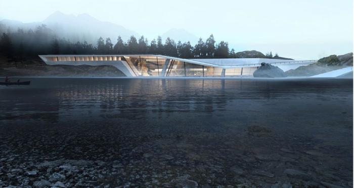 По проекту отель выступает из рельефа и спускается террасами к воде. Скелет отеля - это путь, огибающий камни, образуя смотровую тропу. Вход в отель будет проходить через Большую Велсовскую пещеру – одну из самых протяженных на Вишере (ее длина - 280 м).