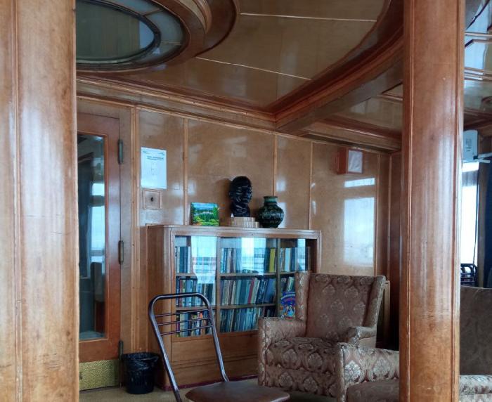 «Павел Бажов» сейчас стоит в затоне, и реставраторы должны успеть сделать работу до весны. «Кают-компания – полукруглая, очень красивая комната, с двумя колоннами с латунными деталями. Это комната досуга для пассажиров с библиотекой и шахматными столами, расставленными по окружности», - говорит Никита Гилев.