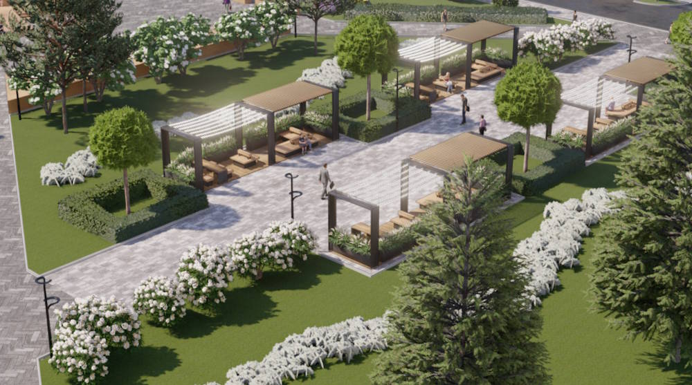 Планируется установить новые скамейки и небольшую уличную сцену из террасной доски. Появится также входная П-образная арка. Для отдыха будут оборудованы модули - парклеты - с навесами, сиденьями и столиками.