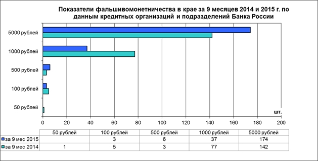 За девять месяцев года в Пермском крае выявлено на 3% меньше поддельных купюр, чем за аналогичный период прошлого года. По данным Банка России изъято 220 фальшивок. Основная масса фальшивок – пятитысячные купюры, их доля 74%. Тысячерублевые фальшивки изымались в 17% случаев.