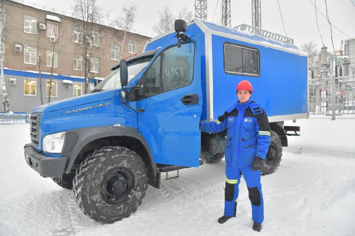 Грузопассажирский автомобиль «Садко NEXT» 4х4 имеет мощность двигателя 148 лошадиных сил и способен перевозить нескольких человек (двух - в кабине и шестерых - в кузове) и необходимое в работе энергетиков оборудование.