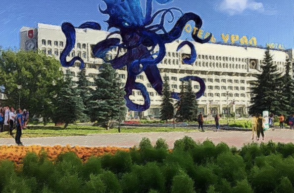 его первых иллюстрациях летающая тарелка зависает над Заксобранием, а в Каме плавают лох-несские монстры. На этот раз фотограф "запечатлел" гигантского осьминога над гостиницей «Урал» и надпись «Счастье не за горами» в самом центре города.