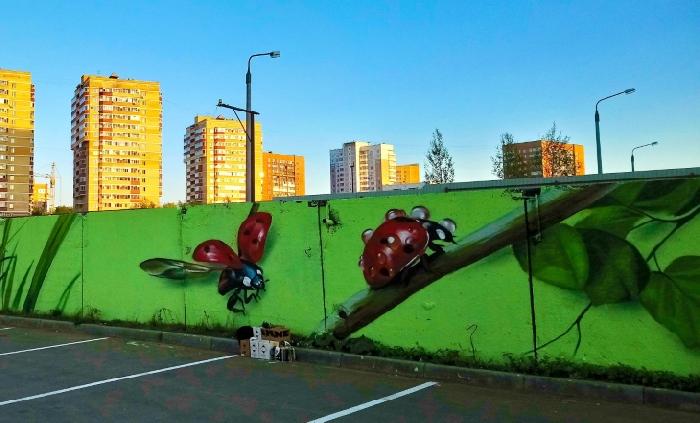 Пермский художник Висмут Тляшев нарисовал собственные «Длинные истории». На заборе по адресу ул. Кронштадтская, 51 он изобразил мир насекомых.