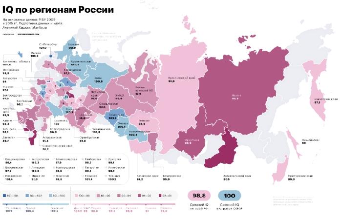 карту IQ жителей российских регионов, составленную Анатолием Карлиным (иногда его ошибочно называют Антатолий). Автор вычислил, что средний уровень интеллекта жителя России 98,8. В Москве он равен 106,3; в Пермском крае 97,8; в Свердловской области даже меньше - 96,6.