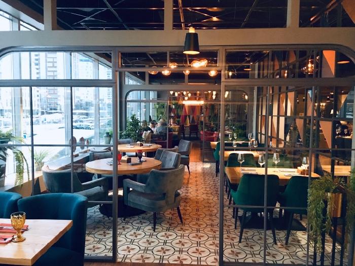 В нём около 130 посадочных мест, пространство поделено на зоны прозрачными перегородками и искусственными растениями. Кухню сделали открытой, расположив её в центральной части ресторана.