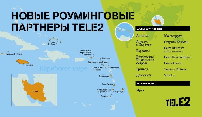 Tele2, альтернативный оператор мобильной связи, запустил роуминг на островах Карибского бассейна в сети Cable & Wireless. В Иране клиенты оператора могут также пользоваться услугами международного роуминга в сети MTN Irancell.