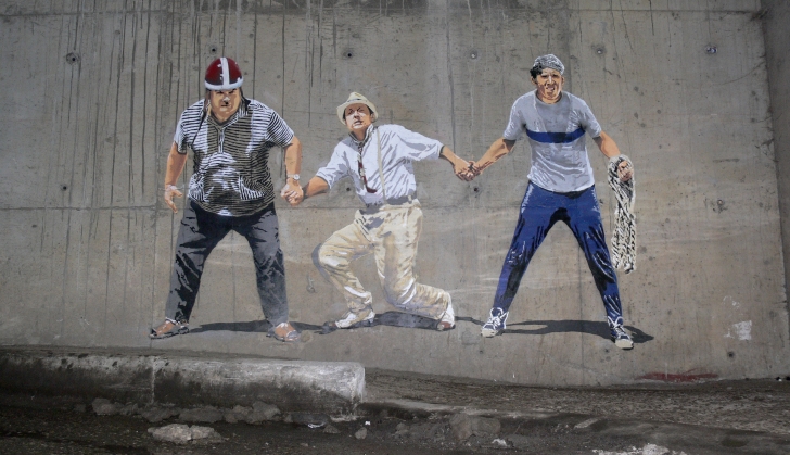 Пермский уличный художник, работающий под псевдонимом Виктор «Фрукты», нарисовал картину на подземной парковке ТРК СемьЯ. Это известная троица из советской комедии – Трус, Балбес и Бывалый.