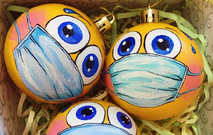 В Перми начали продавать елочные шары в духе пандемии. Новогодние украшения рисует пермская художница Елена Хасанова. Шарики «Смайлик в маске» были разрисованы в качестве эксперимента.