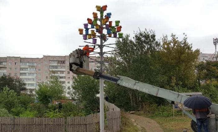 В Перми возле реки Уинка появился новый арт-объект - искусственное дерево с множеством цветных скворечников. Его открыла команда проекта «Подари планете жизнь» и назвала его «Дом Ста Птиц». Официальное открытие арт-объекта состоится 16 сентября. Он размещен при входе в Сад Соловьев рядом с домом по улице Аркадия Гайдара, 5.