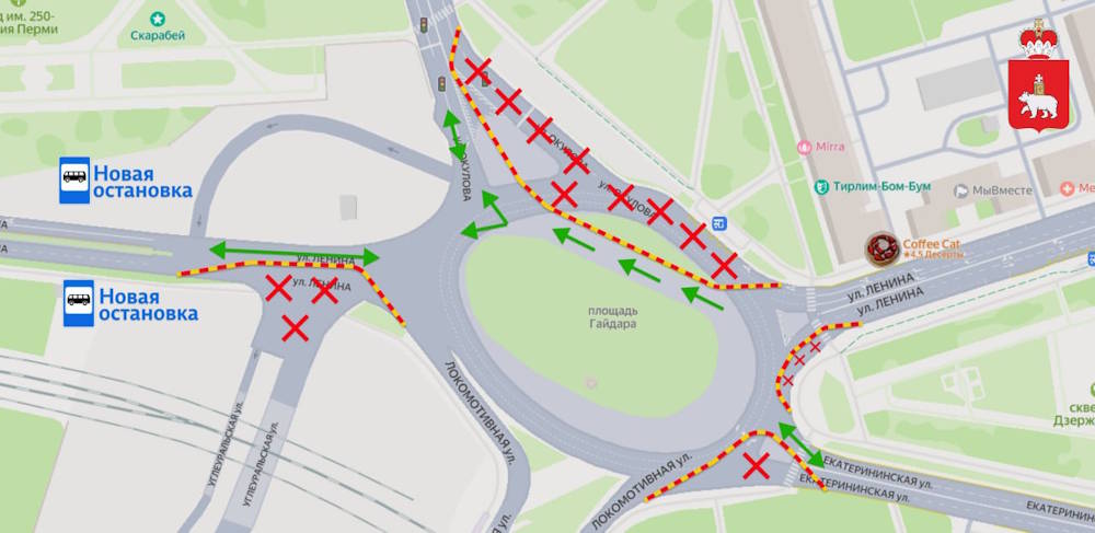 С 3 по 31 августа в Перми изменится движение транспорта по кольцу на площади Гайдара. Заезд и выезд на него с улиц Ленина, Окулова и Екатерининской вместо двух будет осуществляться по одной полосе.
