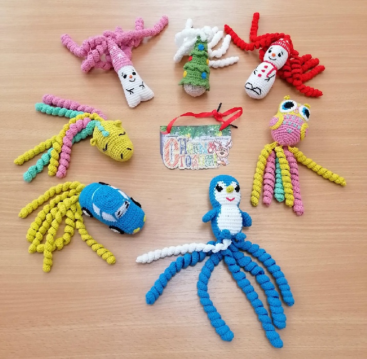 Игрушки в виде дедов морозов, снеговиков, мандаринов, драконов и пр. связали участники клуба «28 петель». Комфортеры связаны только из 100% натуральной шерсти, т.к. шерсть с длинным ворсом, пушистая, грубая или с жёсткими вкраплениями в волокнах категорически не подходит для недоношенных малышей. Пушистый длинный ворс может попасть в дыхательные пути, а грубая шерстяная нить повредить нежную кожу ребёнка.