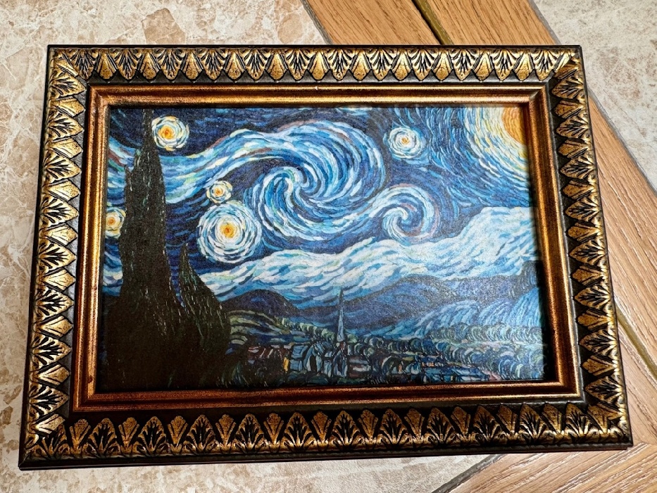 Десерт выполнен в виде картины в раме. Так необычно шеф-кондитер «упаковал» медовый торт. Например, есть десерты – съедобные картины «Ночная терраса кафе» и «Звездная ночь».