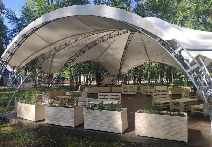 В шатре установлена экологичная мебель и цветники. Планируется, что шатер будет использоваться не только летом - его конструкция устойчива к непогоде.