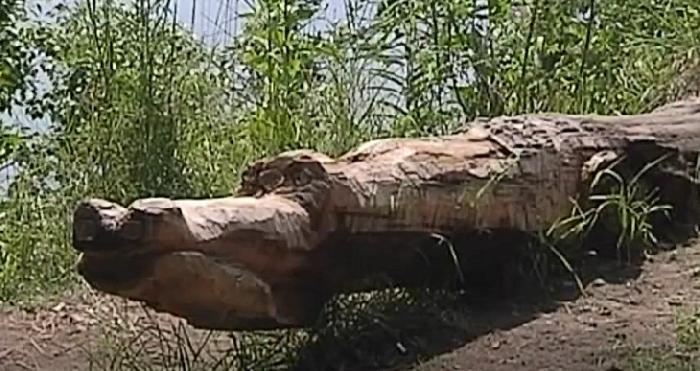 Здесь пенсионер создал портрет Че Гевары, ведьму на метле, лешего, крокодила и других героев. Он рассказывает, что использует только естественные неровности на стволах деревьев.