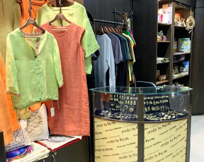 В шоу-руме продаются сувениры, украшения, книги, аксессуары. Эту «точку» KAMWA развивает совместно с пермским дизайнером Алексеем Вороном. В шоу-руме он представил свой бренд Voron.a.design – одежду и аксессуары.